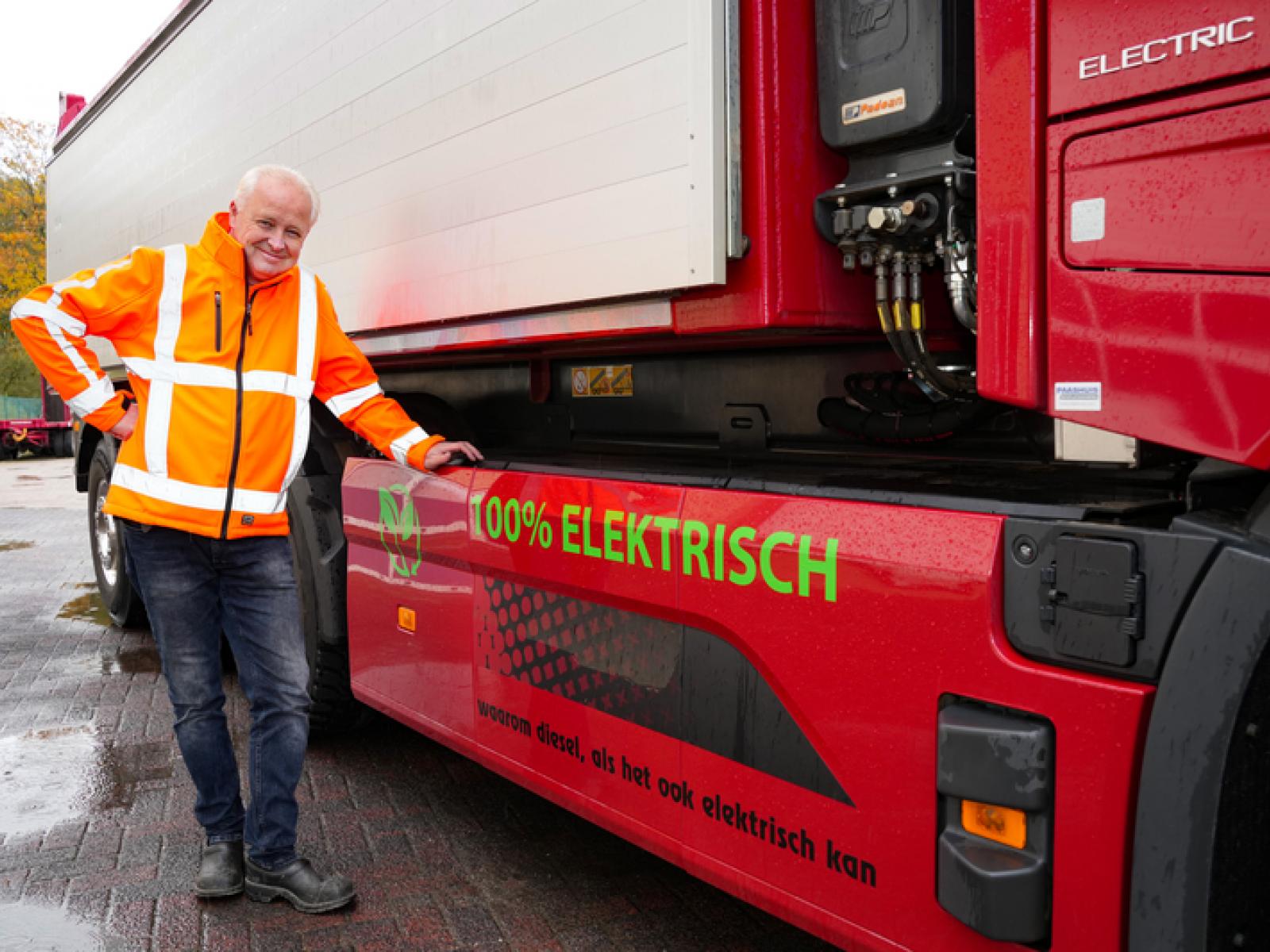Het pronkstuk van familiebedrijf Te Loo Eefde staat netjes geparkeerd voor de hoofdingang van de transportonderneming die sinds vijf jaar in Vorden zetelt. Vanuit het kantoor is er nog net een glimp op te vangen van de knalrode elektrische vrachtwagen, een Volvo FH 8x4 kiepwagen. Leuk detail op de zijkant van de wagen is dat het logo van een kiepwagen is voorzien van een stekkertje. En onderaan de vrachtwagen prijkt de tekst: Waarom met diesel als het ook elektrisch kan? De stekker en de slogan zijn bedacht door Anne en Sophie; de 16-jarige tweeling van Henri en Audrey te Loo die sinds 2010 de scepter zwaaien over het familiebedrijf.