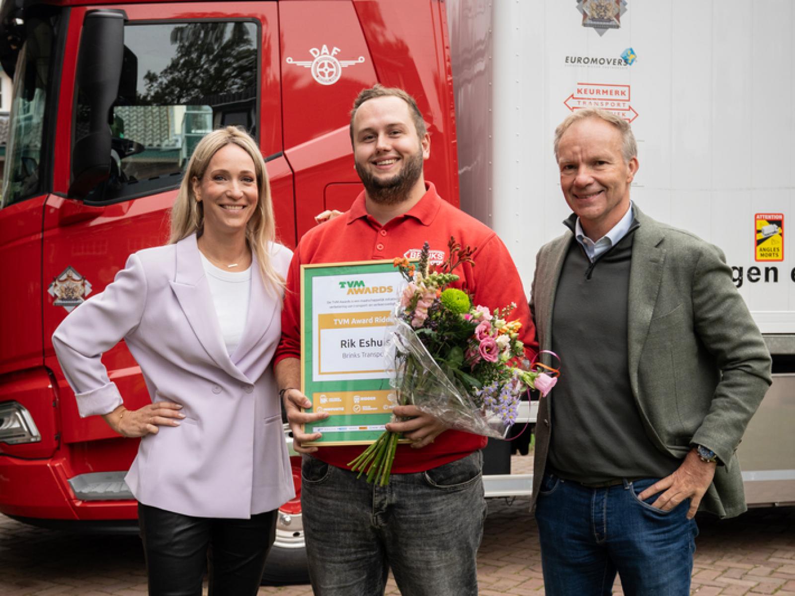 Het is klokslag half elf als Rik met zijn rood-witte vrachtwagen van Brinks Transport het terrein van Bouw & Infra Park in Harderwijk opdraait. Wanneer hij op de parkeerplaats zijn familie en werkgever ziet staan, verschijnt er een grote glimlach op zijn gezicht. Als Eshuis uit zijn cabine stapt, en er een daverend applaus volgt, wacht Michel Verwoest, CEO van TVM, hem op met de award ‘Ridder 2025’.