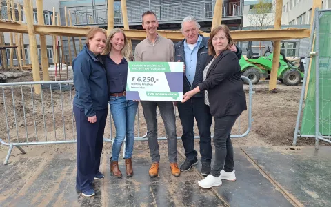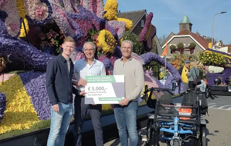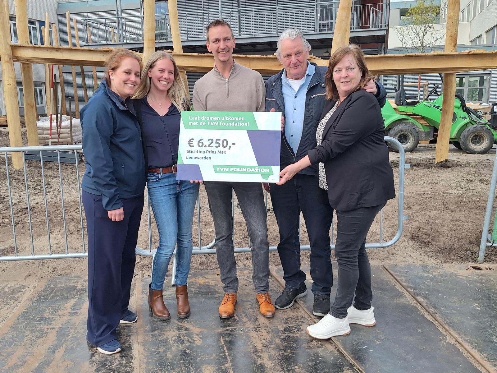 De cheque werd symbolisch overhandigd door Hendrik de Jonge, penningmeester van de TVM foundation, samen met Simone Mulder (TVM) en aanvragers Aukje en Klaas Westra van Klaas Westra Transport.